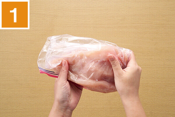 ジッパー付きの保存袋に鶏むね肉・砂糖・塩・水を入れ、密閉して揉みこみ、冷蔵庫で1時間程寝かせる。