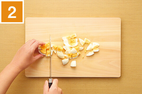 ゆで卵・トマト・きゅうりは1cm角に切る。コーンは水分を切っておく。