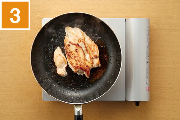 フライパンに油を入れて中火にし、水分を拭いた鶏むね肉を蒸し焼きにする(片面2分、裏返して4分)。火が通ったら粗熱を取り、1cm角に切る。
