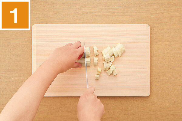バナナ・キウイ・黄桃はそれぞれ1cm角に切る。 |