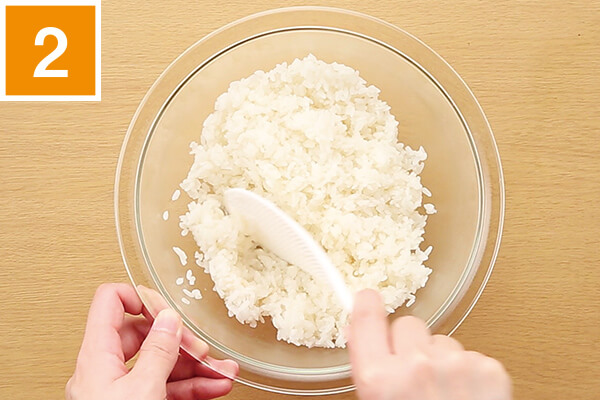 ボウルにご飯と(A)のすし酢を加えてよく混ぜ合わせ、冷ましておく。
