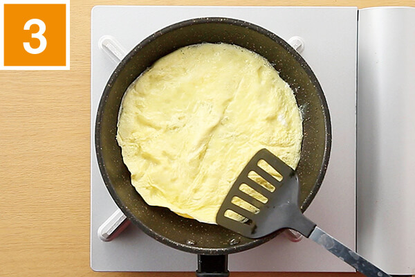 フライパンにサラダ油をひいて中火で熱し、溶き卵を流し込む。両面を焼き、細切りにして錦糸卵を作る。