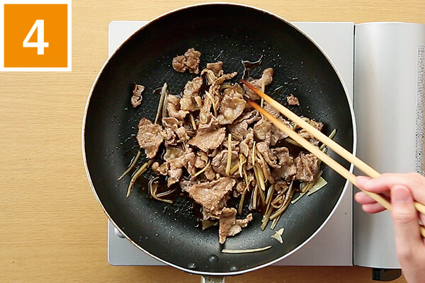 中火で熱したフライパンに、牛ばら肉・しょうがを加えて炒める。全体の色が変わったら(B)を加え、軽く炒める。