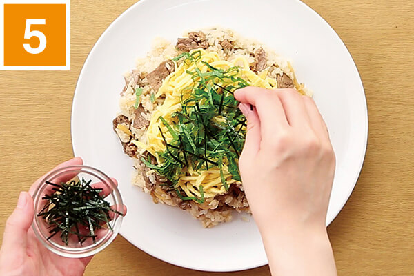2の酢飯に4を混ぜ合わせて皿に盛り付け、錦糸卵・大葉・きざみのりをのせたら完成!