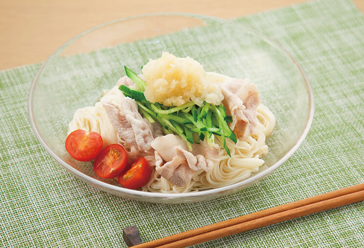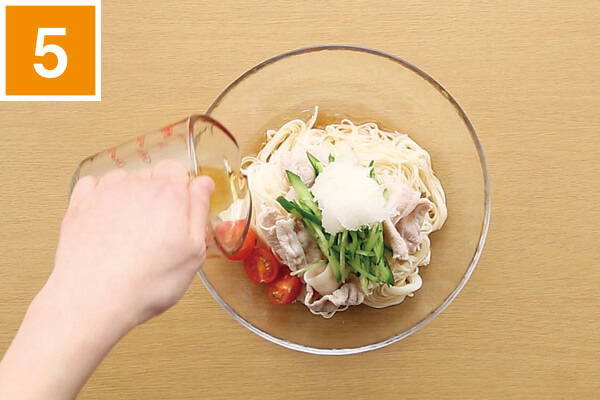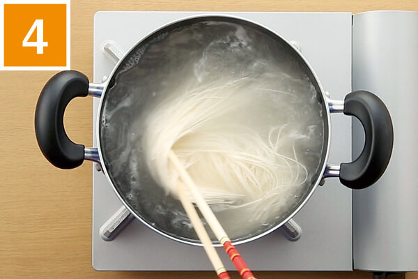 鍋に湯を沸かし、そうめんを表記時間どおりに茹でる。流水で洗い、水気をしっかり切る。