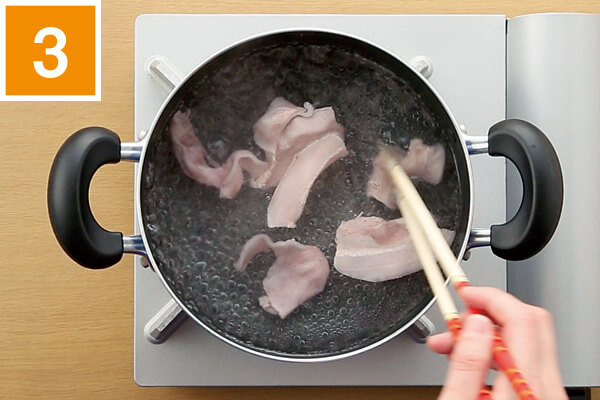 鍋に湯を沸かし、(A)を入れる。豚ロースをさっと茹で、火が通ったら冷水にさらして水気を切る。