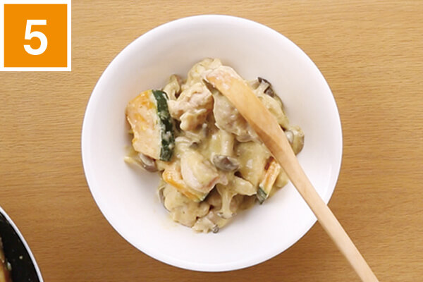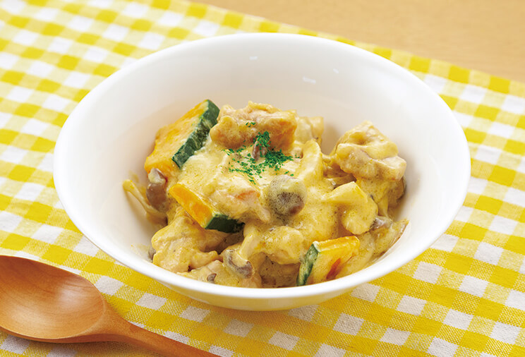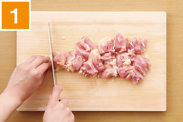 かぼちゃは1cm幅に切る。鶏もも肉は一口大に切り、塩・こしょうで下味をつけ、薄力粉をまぶす。