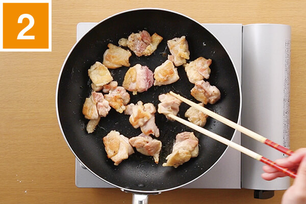 フライパンにオリーブオイルを入れて中火で熱し、鶏もも肉を入れて全体に焼き色がつくまで焼く。