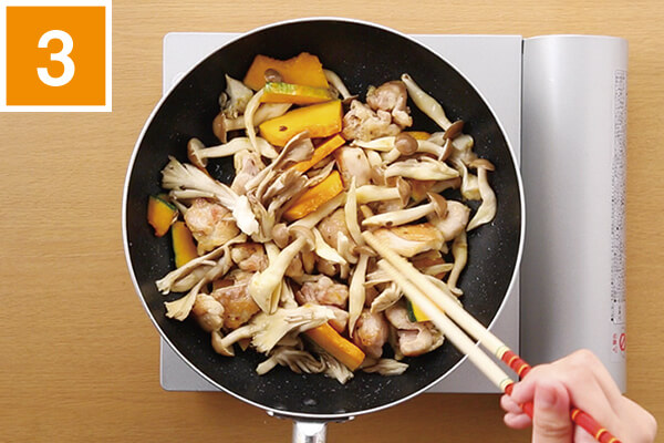 しめじ・まいたけ・かぼちゃを加え、焼き色がつくまで炒める。