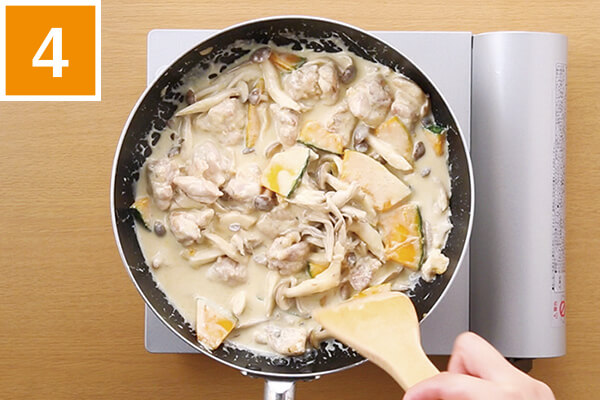 弱火にして、牛乳・生クリーム・(A)を加え、とろみがつくまで軽く混ぜながら煮詰める。