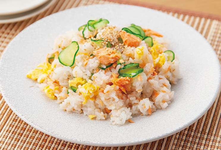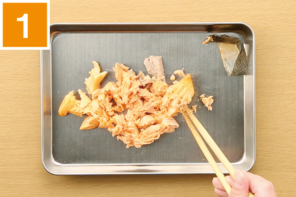 オーブントースターで塩鮭を10分ほど焼く。皮と骨を取り除き、ほぐしておく。
