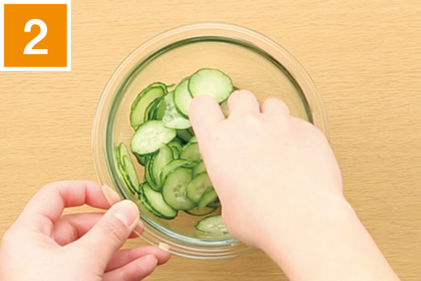 きゅうりをスライスして塩もみし、水気をしぼる。