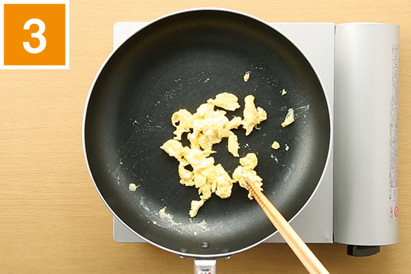 フライパンに油(分量外)を引いて中火で熱し、溶き卵を流し入れていり卵をつくる。