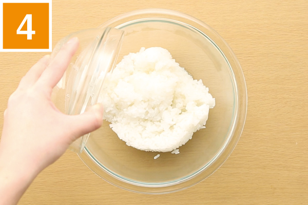 ボウルにご飯と(A)のすし酢を加えてよく混ぜ合わせ、酢飯をつくる。