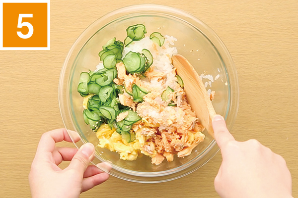 4に1・2・3・いりごまをのせ、全体的に混ぜ合わせる。お皿に盛り付けたら完成。