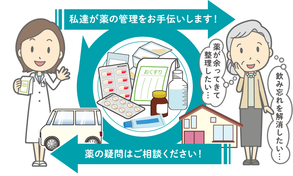 訪問薬剤管理指導とは、薬剤師が患者様のご自宅や施設まで訪問し、薬の管理を行うサービスです。