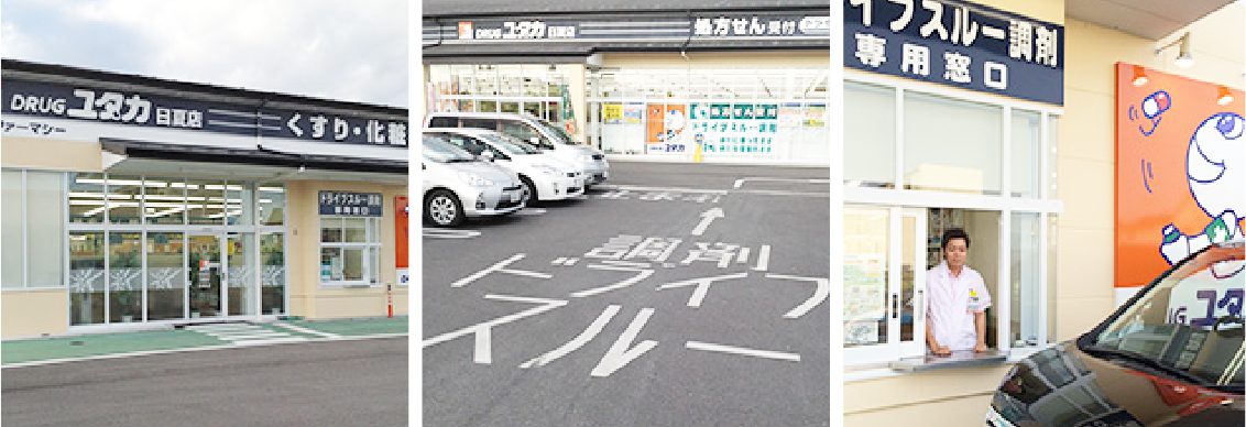 日夏店の一番のポイントは、ドライブスルー調剤を全店で一番最初に導入致しました。日夏調剤で応需する処方箋内容は、特定の科を持たず、総合処方に対応し100%面調剤となっております。小さなお子様連れの方や、お身体が不自由な患者様など様々な不安を抱えておられる患者様から、ドライブスルーをご利用いただけております。