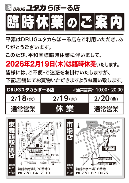ドラッグユタカ らぽーる店からのお知らせ